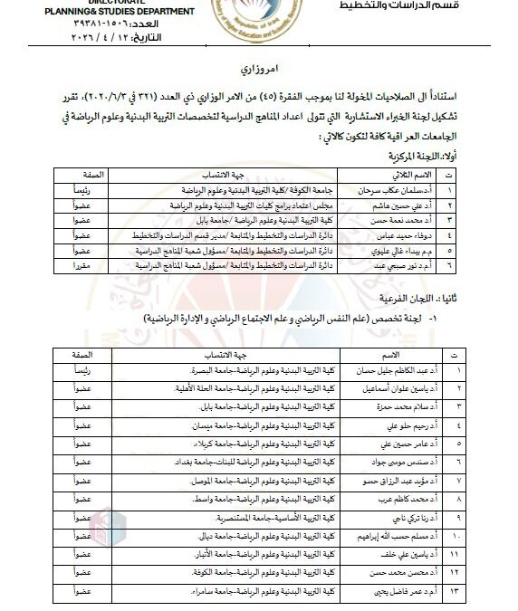 تتقدم كلية التربية البدنية وعلوم الرياضة بأسمى آيات التهنئة والتبريك إلى تدريسييها الأفاضل الذين تم اختيارهم من قبل وزارة التعليم العالي والبحث العلمي لعضوية لجنة الخبراء المختصة بإعداد المناهج الدراسية لتخصصات التربية البدنية وعلوم الرياضة في الجامعات العراقية. ويعكس هذا الاختيار المكانة العلمية المرموقة التي يتمتع بها أساتذتنا الكرام وكفاءتهم الأكاديمية المتميزة. مع تمنياتنا لهم بدوام التوفيق والسداد في أداء مهامهم العلمية